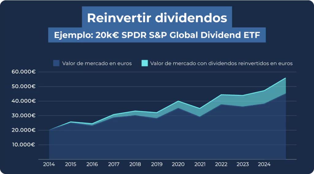En lugar de pagar el dividendo, el ETF lo reinvierte automáticamente en nuevas participaciones. Así aumenta el valor de la inversión con el tiempo gracias al interés compuesto.